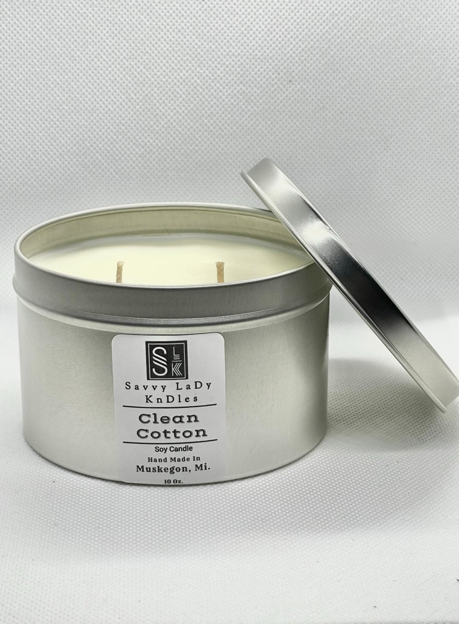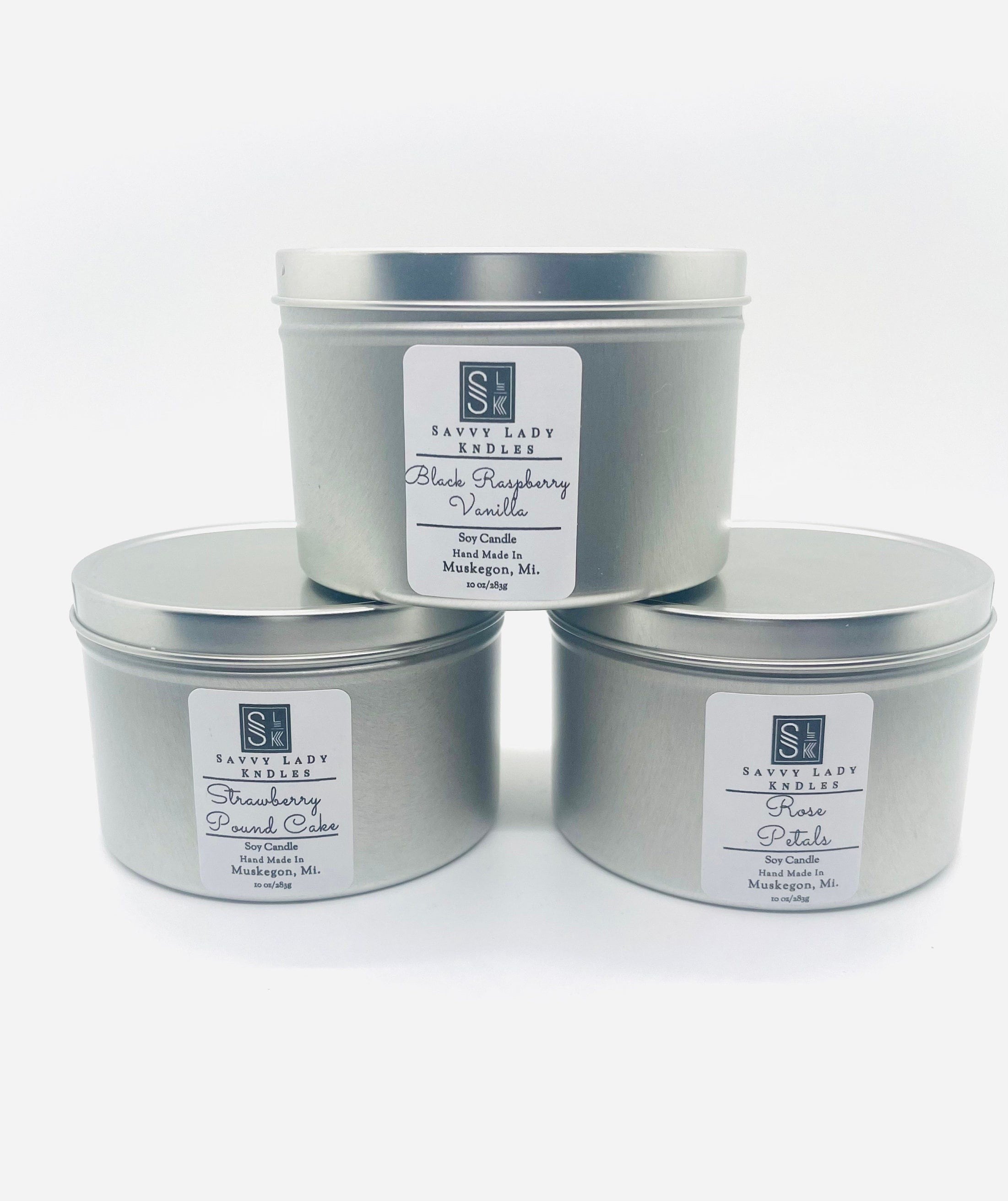 Homemade candles for gift. This listing is for one soy candle. This scented soy candle comes in a silver round metal tin container that can be used for home fragrance or as a candle gift. The handmade scented candle is made from soy wax and have two wicks. The minimalist candle also come in a variety of candle fragrances that are perfect for scenting the environment of any small to medium size area in the home such as a bedroom, dining room, or sitting area. Candle burn time is 55 - 65 hours. Size is 10 oz. Candle color is white to opaque white. Candle style/design is silver, round, seamless, in tin container. This handmade candle also has a minimalist design that is able to blend in with most home decor styles.