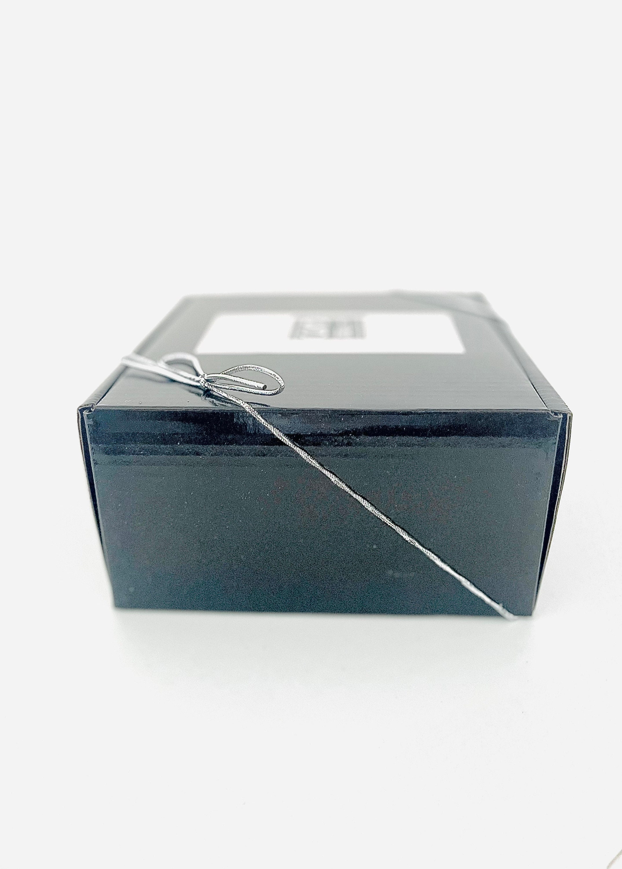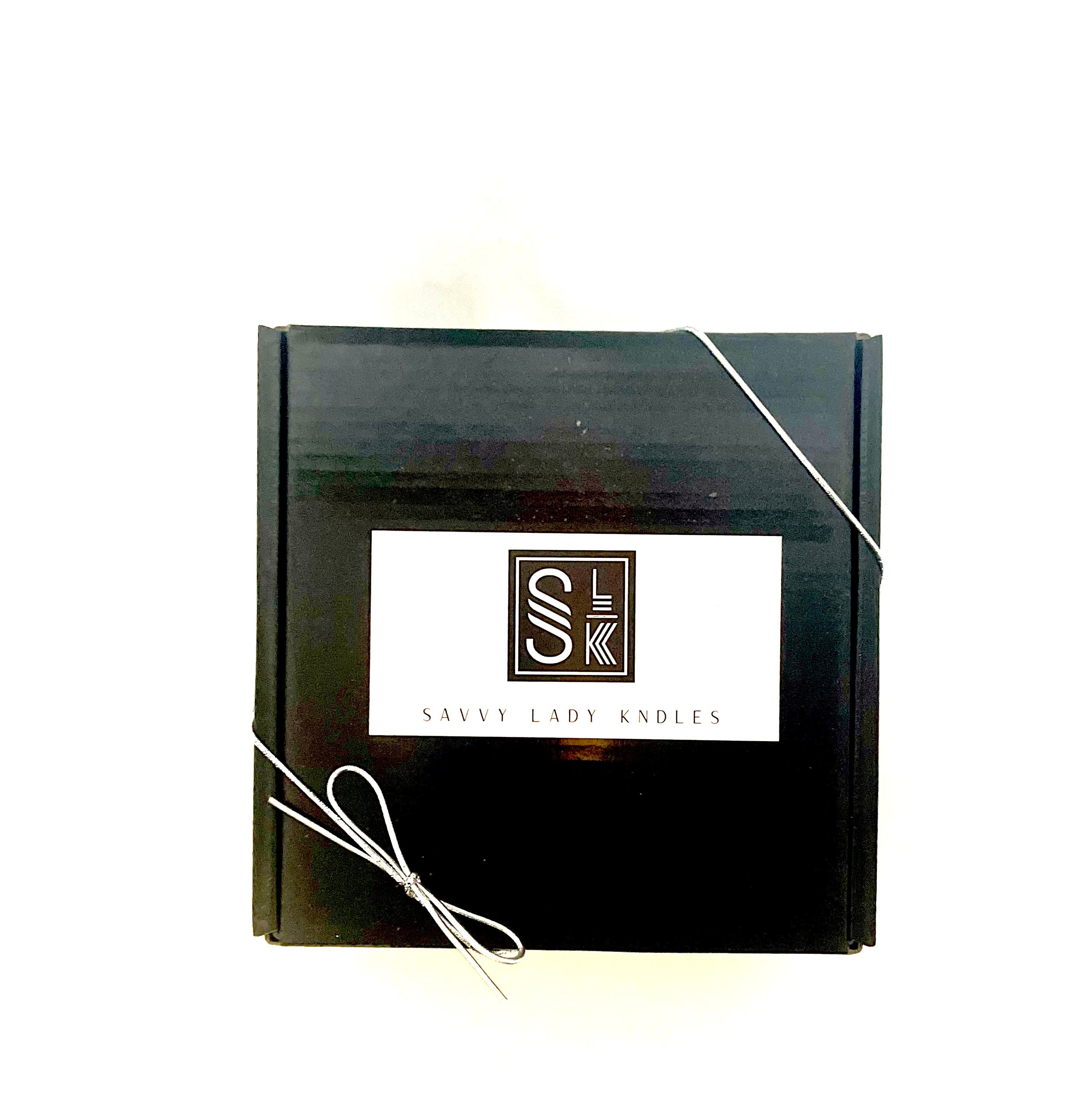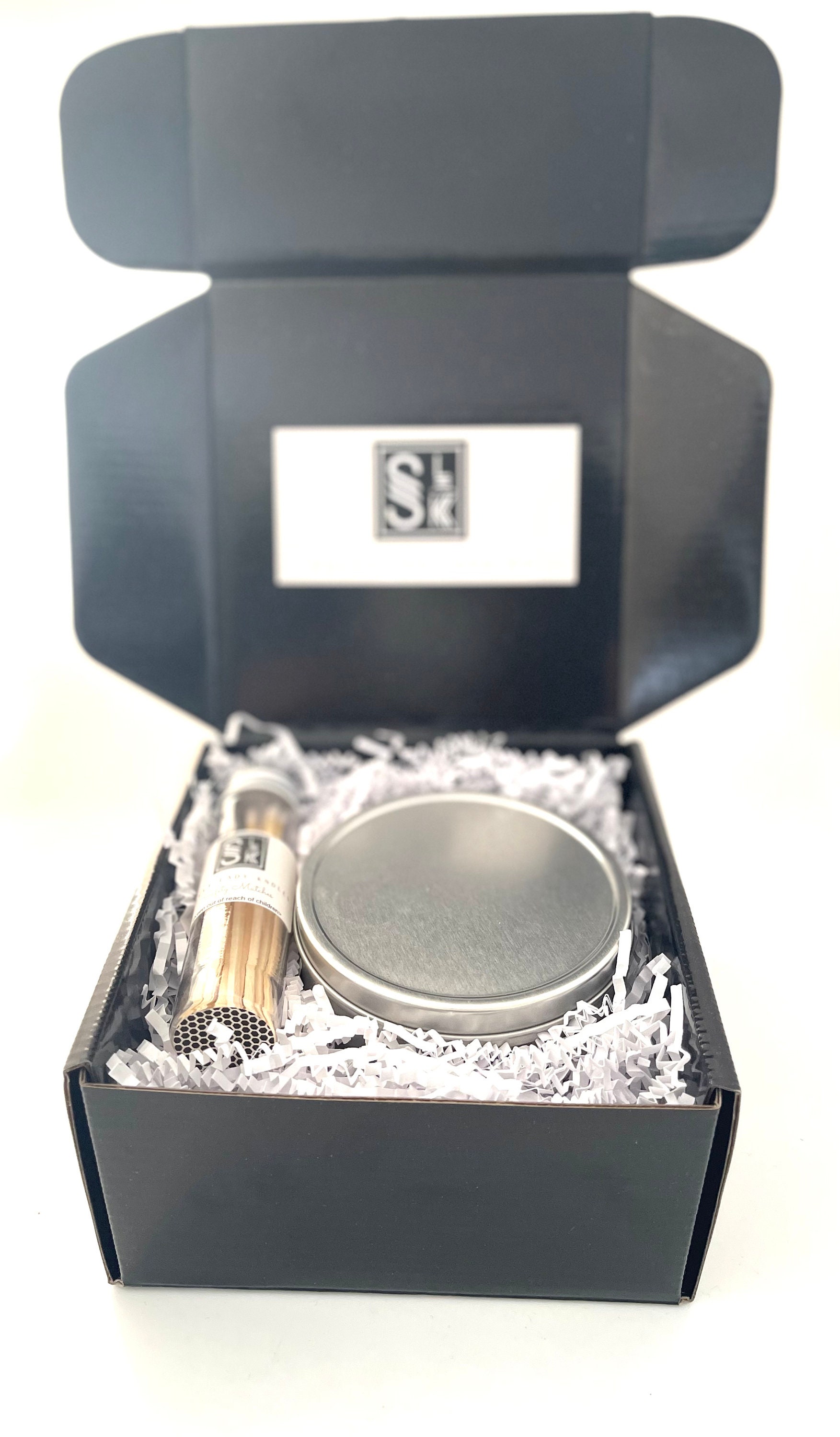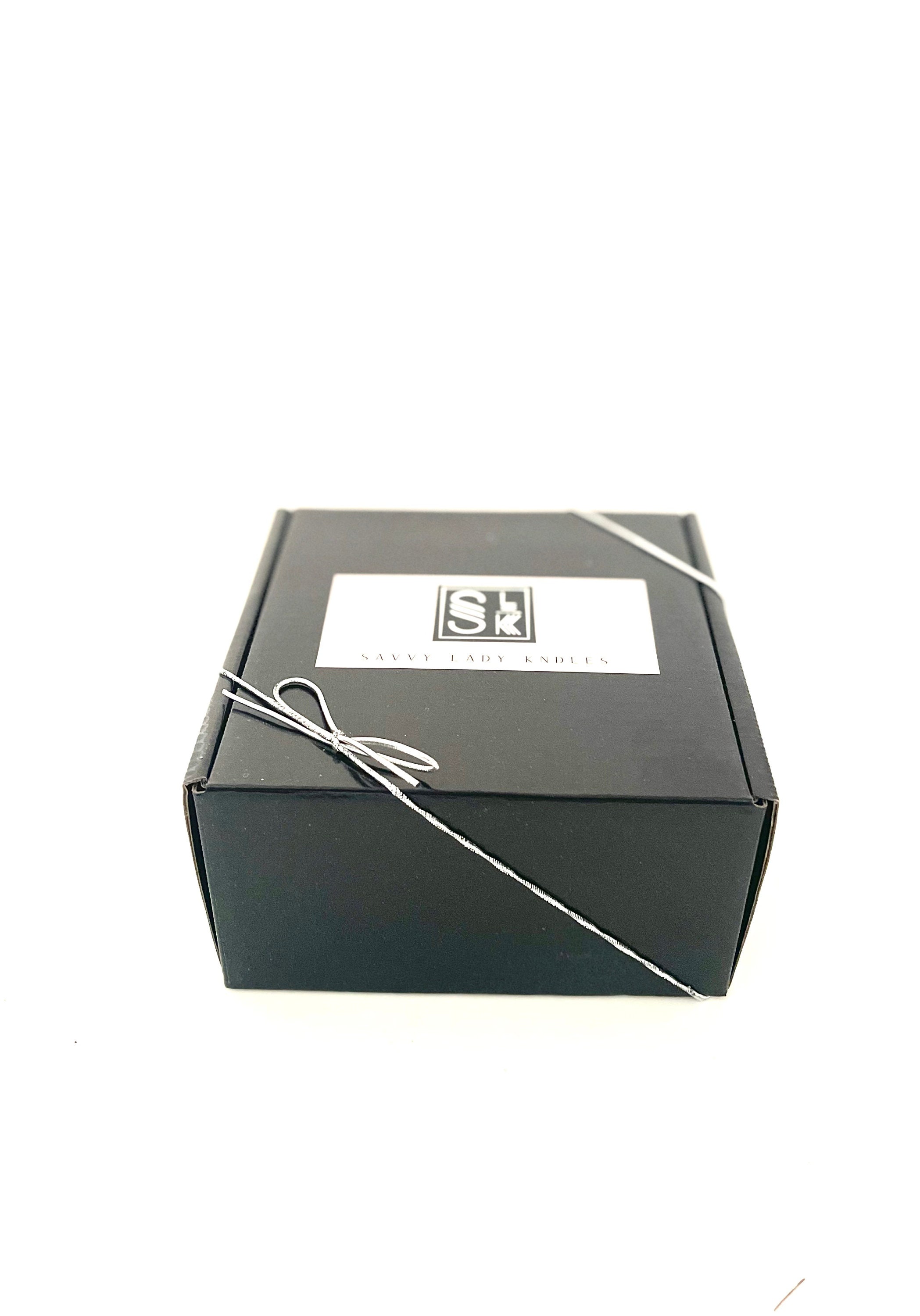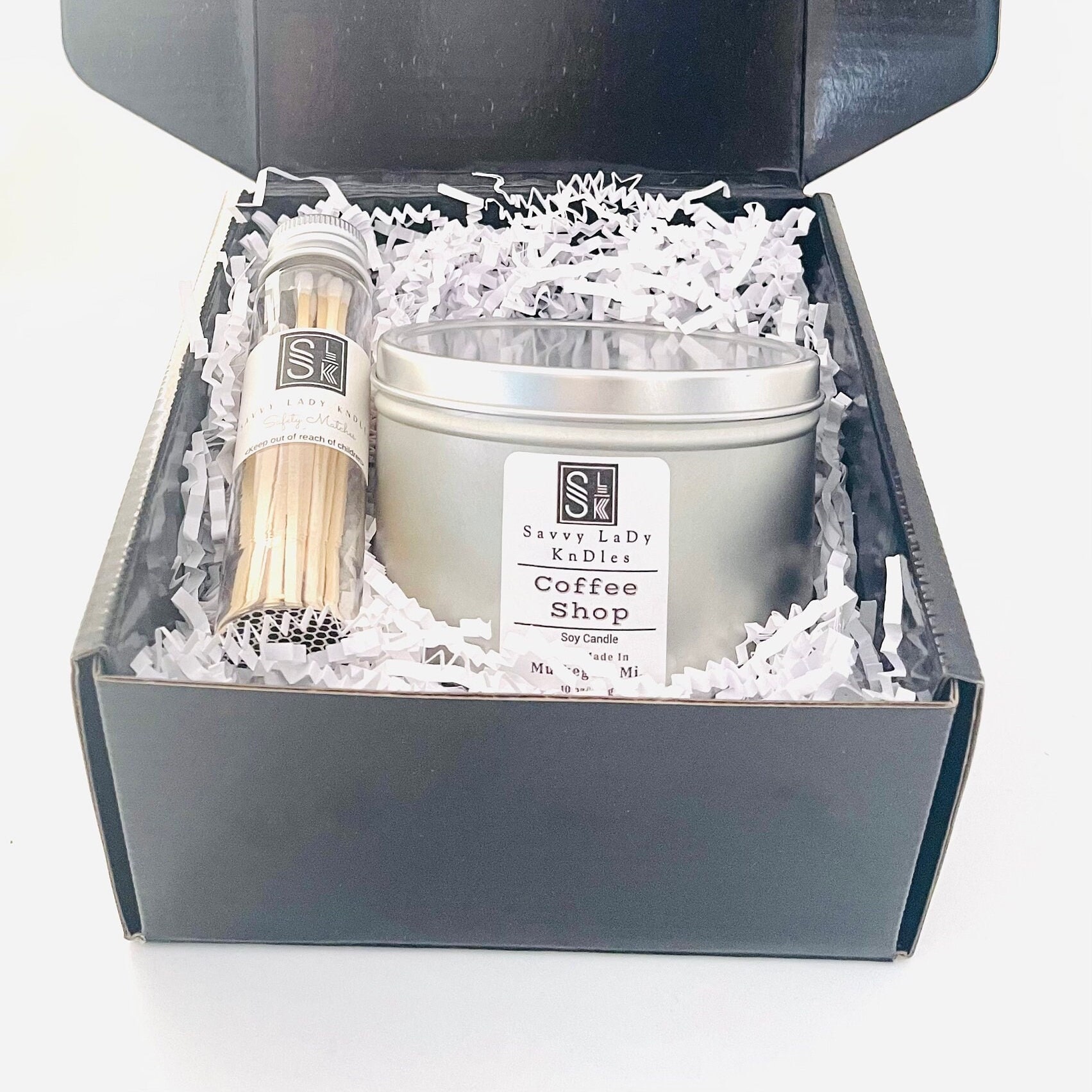 This small candle gift set contains one medium sized soy candle and candle safety matches that are packaged in a black gift box filled with white crinkle paper. The soy candle gift box also has a silver stretch bow attached to the outside of the box.
