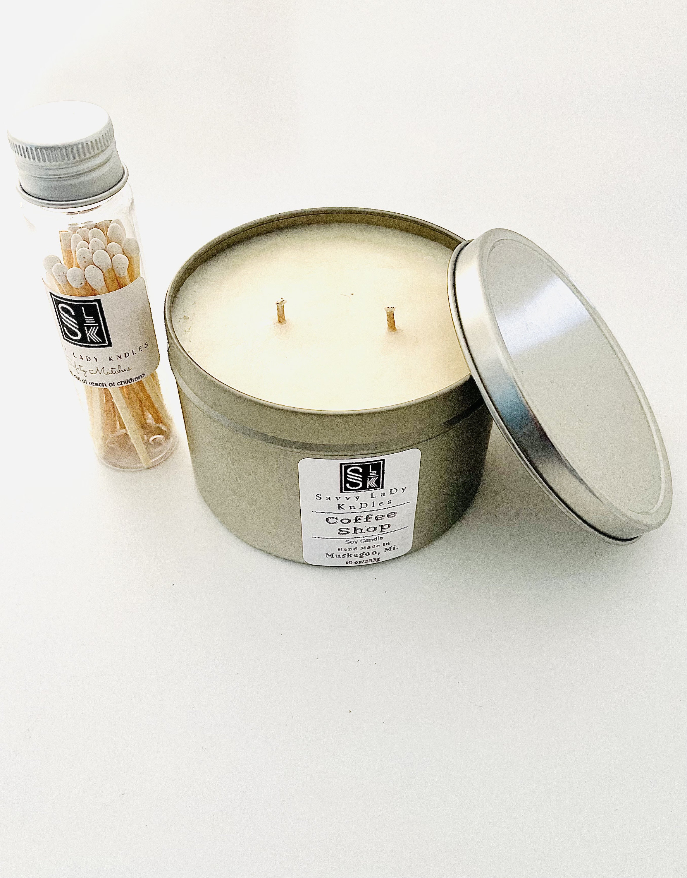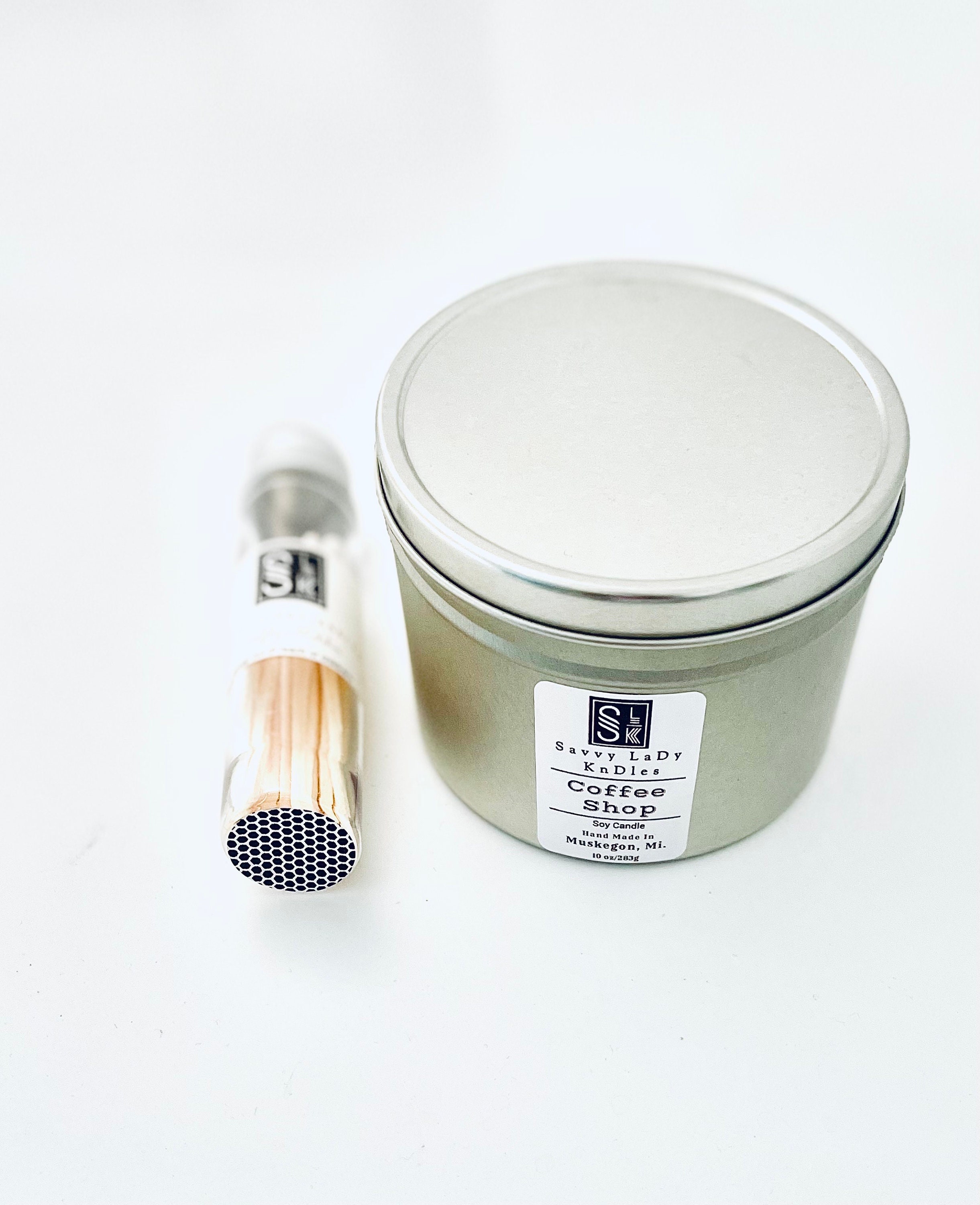 The tin candle in the candle gift set is a double wicked candle made of 100 % soy wax that’s available in a variety of candle scents. The candle is dye free, white to opaque white in color, and 10 ounces in size. The candle container is silver, metal, and round with a lid.