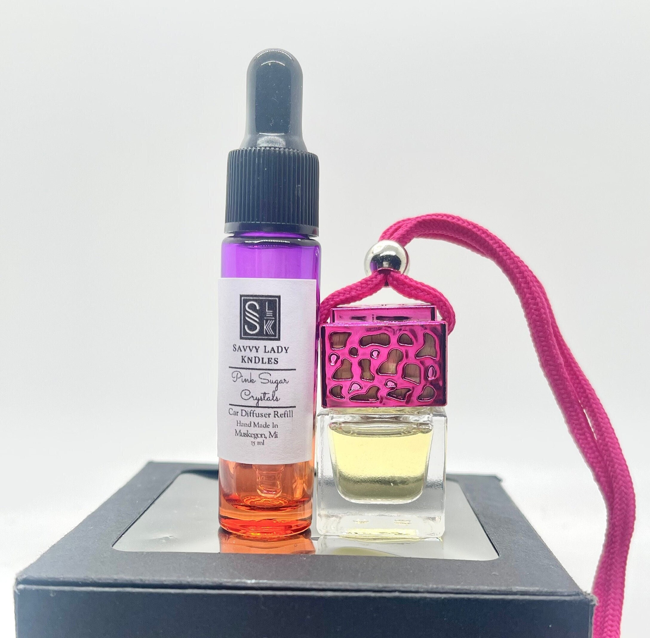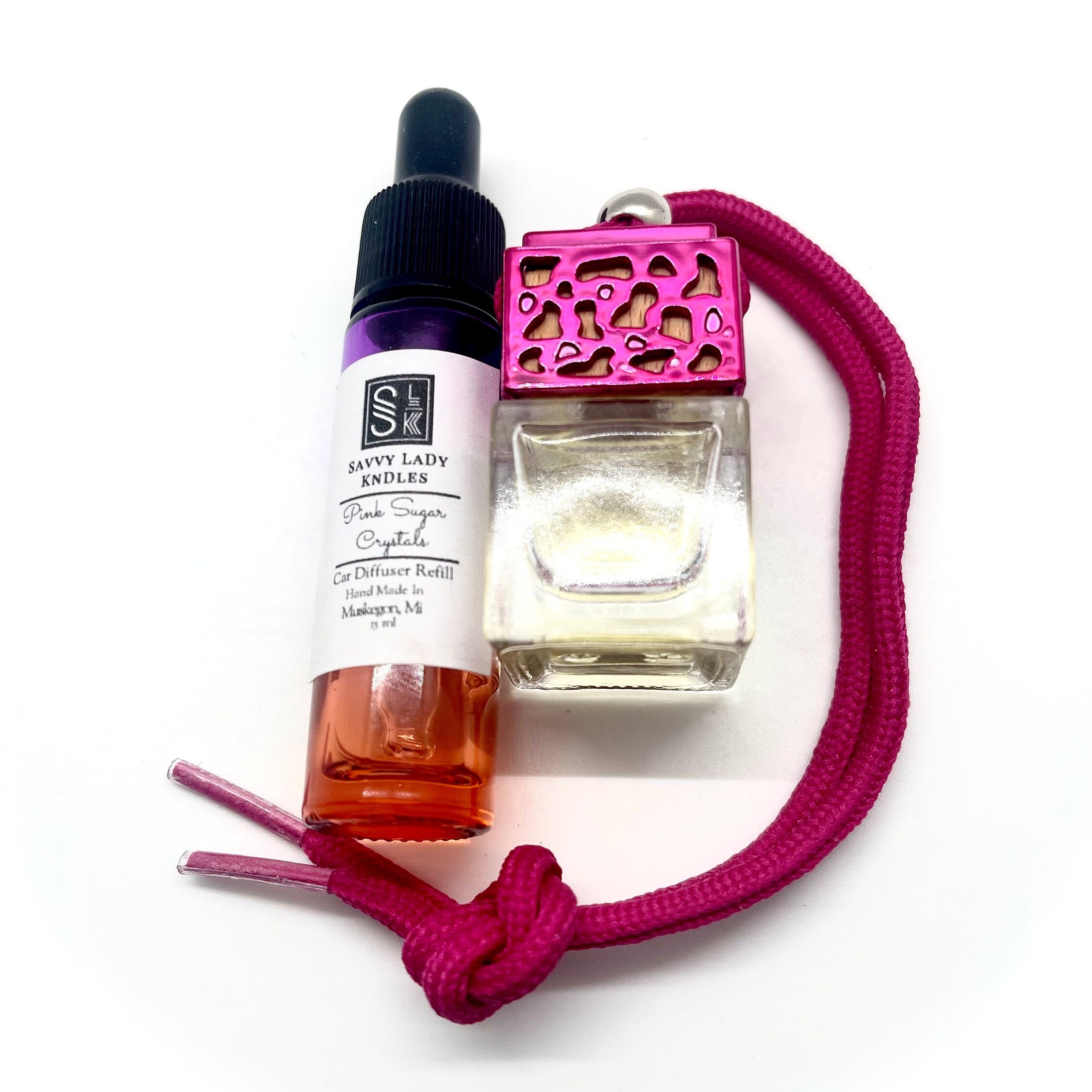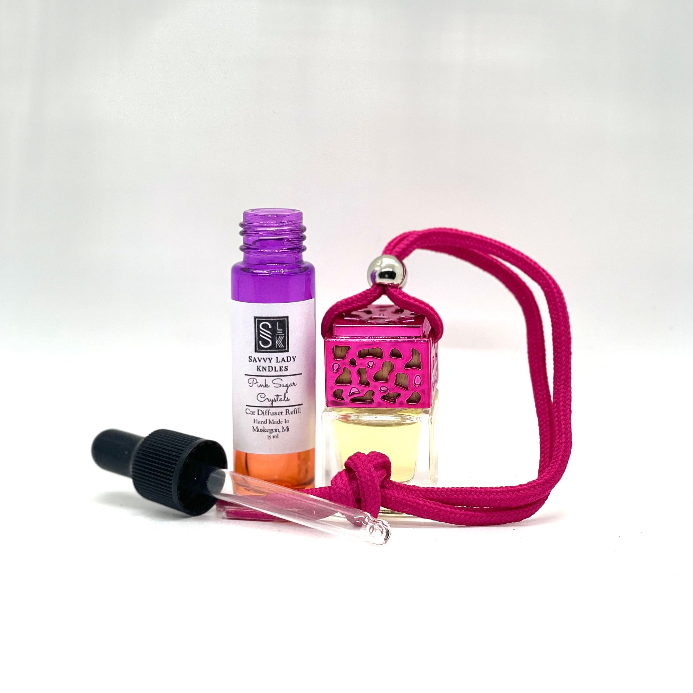 Car Diffuser Refill Set. This listing is for one hanging car diffuser and one car diffuser refill bottle for a rear view mirror. This car decoration can be hung and used as a rear view mirror accessory to scent the air in a car, office, closet, or most any small space where the air needs to be freshened. This car perfume is available in several car scents.