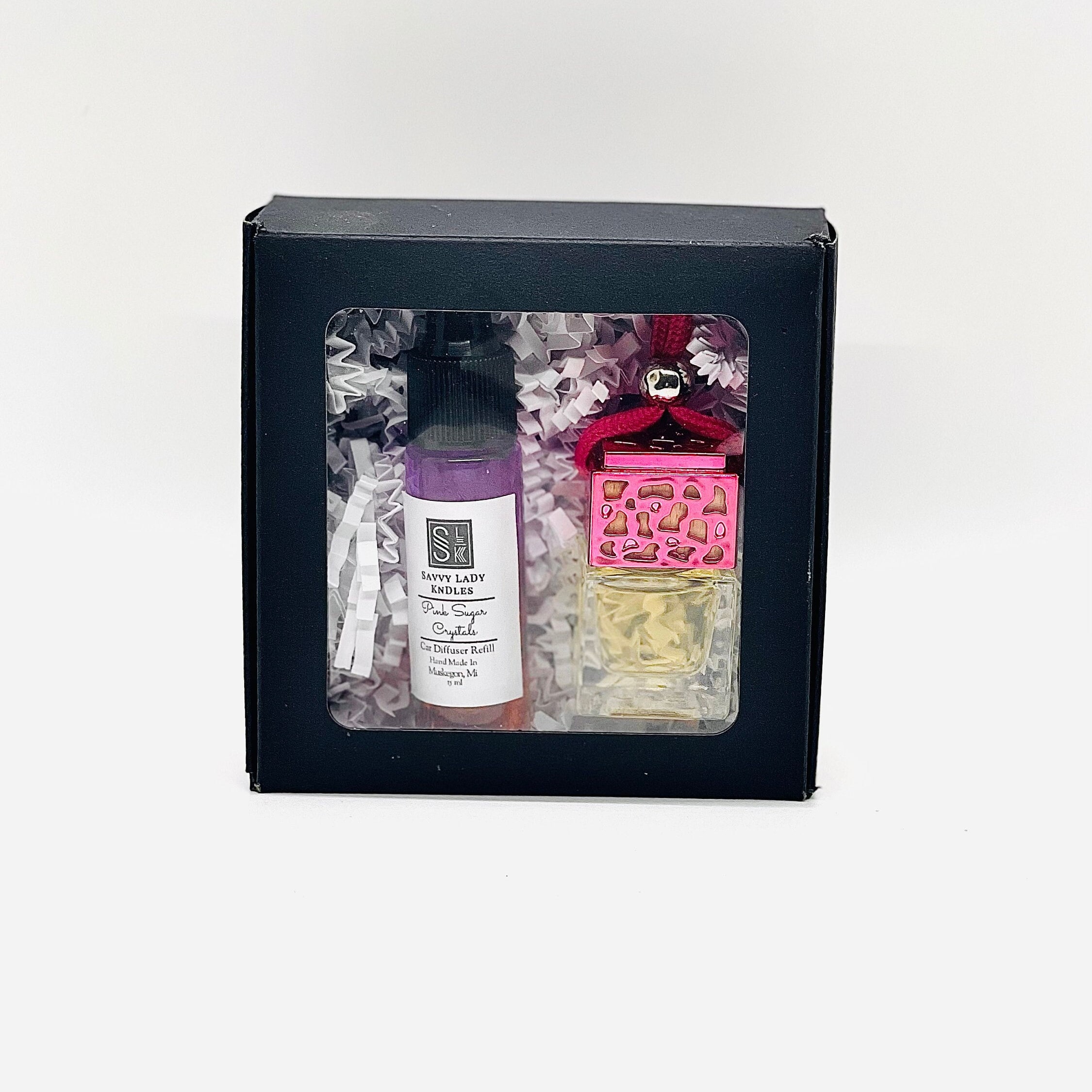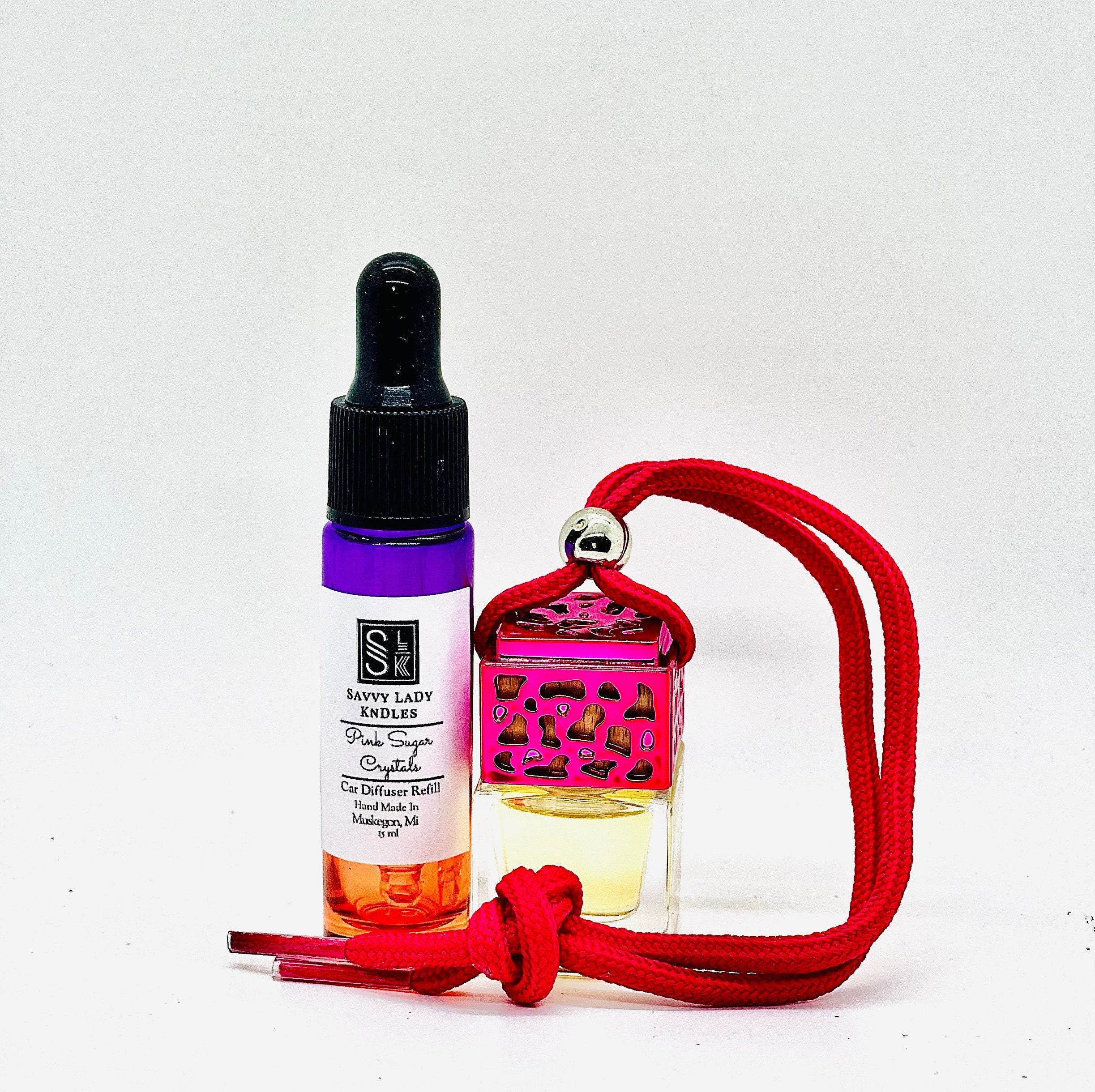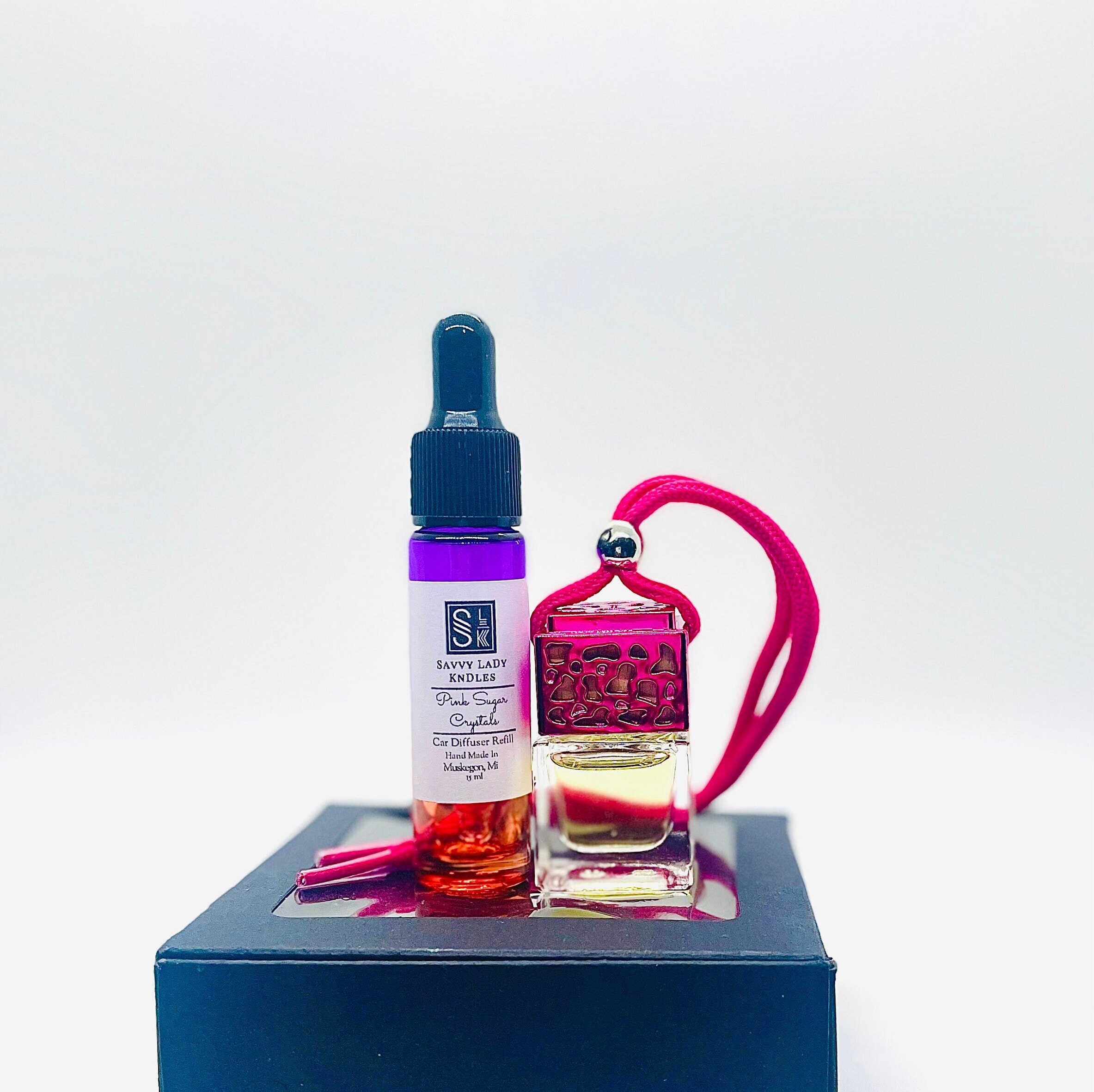 Car Diffuser Refill Set. This listing is for one hanging car diffuser and one car diffuser refill bottle for a rear view mirror. This car decoration can be hung and used as a rear view mirror accessory to scent the air in a car, office, closet, or most any small space where the air needs to be freshened. This car perfume is available in several car scents.